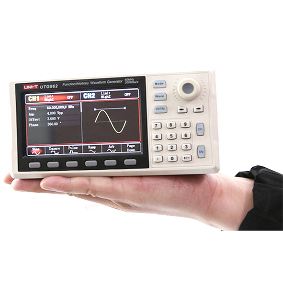 The UTG962E waveform signal generator (AWG) is a compact wonder, designed to fit comfortably in the palm of your hand. This personal signal output source offers unrivaled convenience at your fingertips. With a minimum resolution of 1µHz, its compact and lightweight design makes it a versatile instrument in Uni-t's cost-effective line of waveform signal generators.